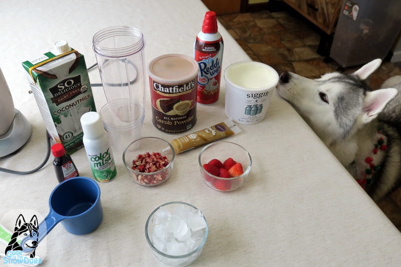 There is no exact measurement for this recipe, but I will give you a rough guess of what I did. The amount I used made 3 of them, one for each of my dogs. I am using my NutriBullet to make these DIY Christmas Tree Frappuccino. Mix together the Yogurt, Coconut Milk, Ice, Peppermint Extract and Carob Powder. Blend until nice and thick. If it’s to thin, add more ice, and if it’s to thick, add more ice.