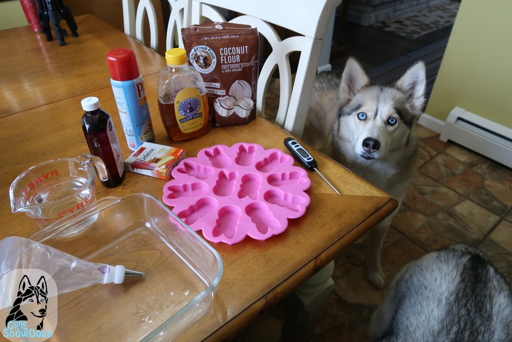 After you have filled your pans, let them sit for at least 4 – 5 hours so that the mixture can properly set. Now you can remove the Marshmallow Peeps from the mold. They will still be sticky, so take a cutting board, and dust it with coconut flour. Lightly tap the Marshmallow Peeps in the flour to help coat the sticky parts, and that’s it! You have now created Marshmallow Peeps for dogs! And yes, you can eat them too!